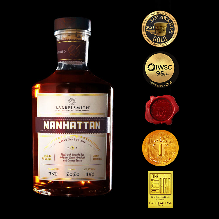 Straight Rye Whiskey and Rosso Vermouth are blended into a Manhattan and then aged in oak barrels. After we taste and determine it is worthy to be labeled Barrelsmith, we then bottle at full strength, 35% ABV (70 proof). We source our aged whiskey from an award-winning distillery. Our own Rosso Vermouth is made from California wine grapes and natural flavors. Barrelsmith Orange Bitters are added after the barrel aging is complete to add a hint of a bright citrus taste. All-natural ingredients, no artificial flavors or colors added.