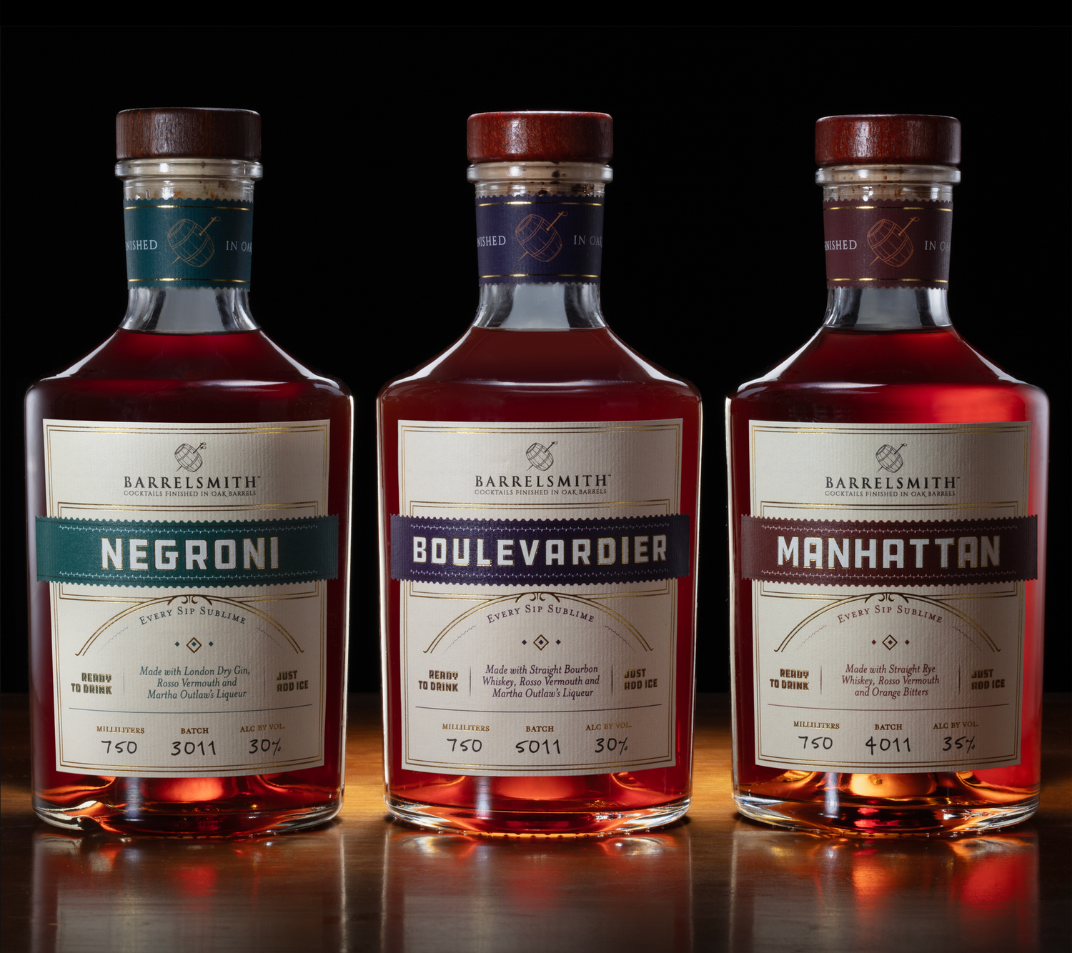 Straight Bourbon Whiskey, Rosso Vermouth, and Martha Outlaw’s Liqueur are mixed into a Boulevardier and then aged in charred oak barrels. After we taste and determine it is worthy to be labeled Barrelsmith, we bottle at full strength, 30% ABV (60 proof). We source our aged whiskey from an award-winning distillery. Our own Rosso Vermouth is made from California wine grapes, natural flavors, and ingredients. Martha Outlaw created her unique liqueur specifically for craft cocktails destined for aging in barrels.